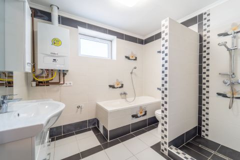 Fürdőszobában kád és zuhanyzó is található, két mosdó, külön helyiségben és a fürdőben is