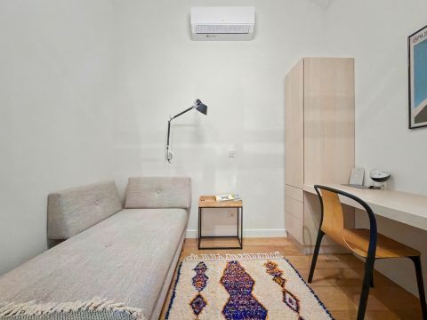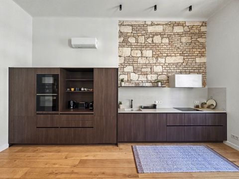A lakás kényelmét elektromos redőnyök, hűtő-fűtő klíma, magas minőségű konyhagépekkel felszerelt konyha biztosítják. A minőségi fa parketta eleganciát és meghittséget sugároz az egész lakásban. Praktikus elrendezésének köszönhetően ideális választás pároknak, kisebb családnak vagy két hálószobát igénylőknek.